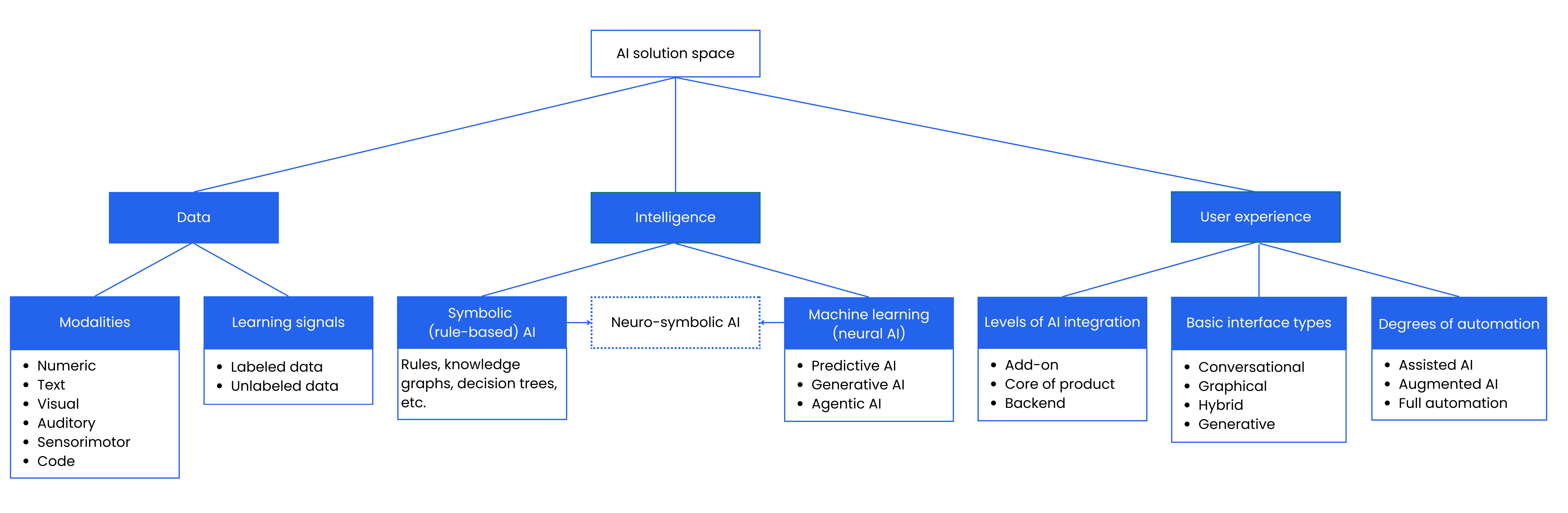 The landscape of AI technologies is broad - it is by far not limited to chat, GenAI, or trendy agents. The AI Solution Space Map allows to you to embrace the full range of possible AI solutions. It organizes AI capabilities across three key dimensions—data, intelligence, and user experience—helping teams avoid premature technology choices and align solutions to real user and business needs. By exploring the full solution space, you can make smarter decisions, especially in a fast-evolving environment where new AI technologies emerge daily.